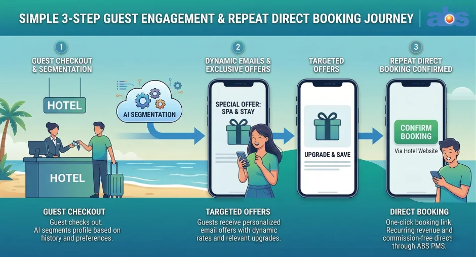 Your ABS Property Management System (PMS) holds the contact details, specific preferences, and complete stay history of your most valuable asset: past guests. By utilizing automated, triggered email campaigns directly from your Property Management System (PMS), you can re-engage this warm audience with zero ad spend.