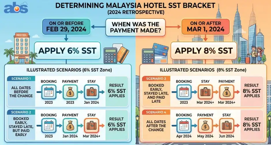 The tax rate is determined by the payment date. Payments made on or after March 1, 2024 must apply 8% SST.